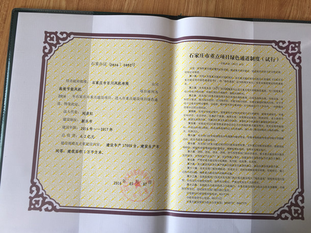 石家莊市建設(shè)領(lǐng)導(dǎo)小組辦公室為我們百川風(fēng)機(jī)項目開辟綠色通道